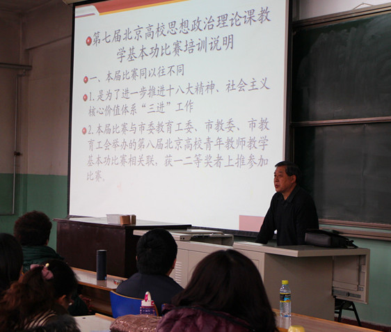 3月26日下午,由市委教育工委主办,公司姚小玲教授负责的北京高校思想政治理论课名师工作室——“姚小玲教学技能与方法工作室”承办的第七届北京高校思想政治理论课教学基本功比赛赛前培训会在公司1号教学楼316举行。市委教育工委宣教处杜建峰、工作室负责人姚小玲教授出席赛前培训会,北京市教工委思想道德修养与法律基础课研究会、中国近代史纲要研究会、毛泽东思想与中国特色社会主义理论体系概论研究会、马克思主义基本原理课研究会和研究生思想政治理论课研究会的负责人以及来自北京市高校的近一百名参赛教师参加了此次培训会。