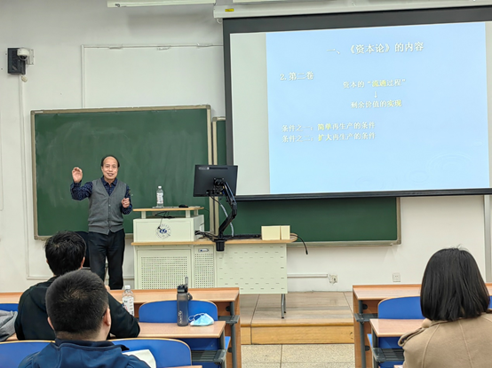 王峰明教授首先从《资本论》三卷的标题出发阐释各卷在逻辑上“正-反-合”的关系,其后深入讲解了各卷的核心内容:马克思在《资本论》第一卷中研究资本的生产过程,聚焦剩余价值的生产,由此展开绝对剩余价值生产、相对剩余价值生产等内容。《资本论》第二卷则研究资本的流通过程,聚焦剩余价值的实现,由此展开简单再生产、扩大再生产所需条件等内容。《资本论》第三卷研究资本主义生产的总过程,聚焦生产与实现之间的矛盾,阐明了资本主义生产方式的固有矛盾。