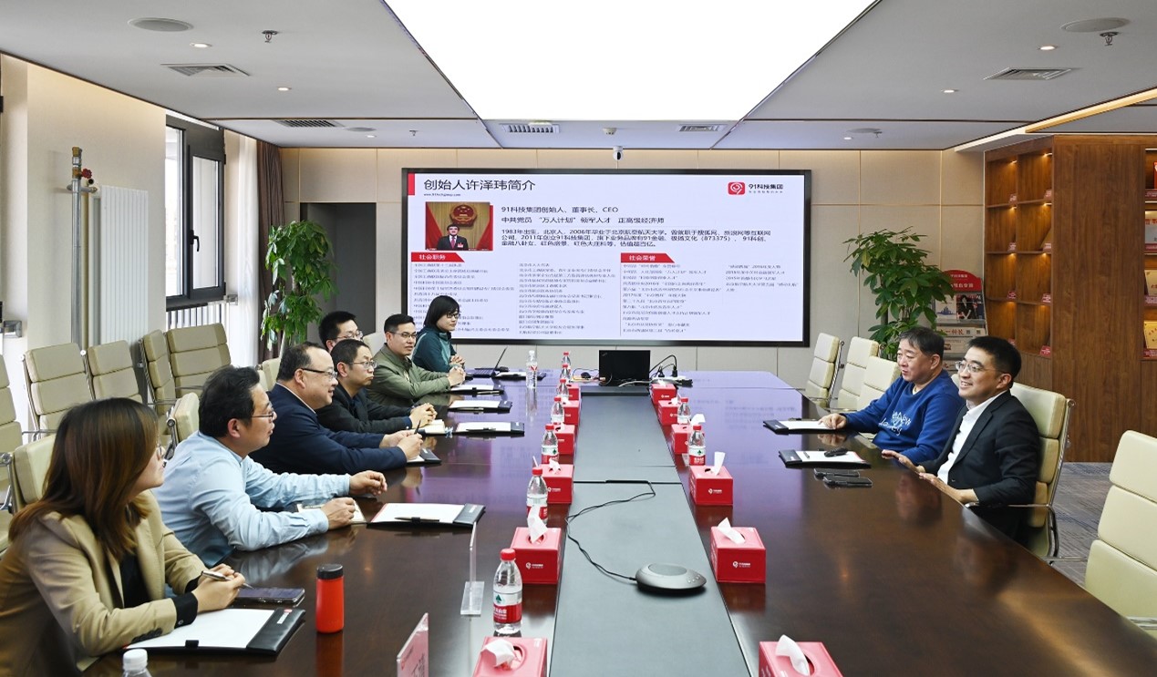 为深入贯彻中央八项规定精神学习教育,以高质量调查研究推动实现高质量发展,4月2日下午,fun88官网体育经理赵义良、党委书记高宁带领公司教师代表赴员工企业91科技集团开展专题调研。91科技集团董事长许泽玮、副总裁赵新热情接待并参与座谈。