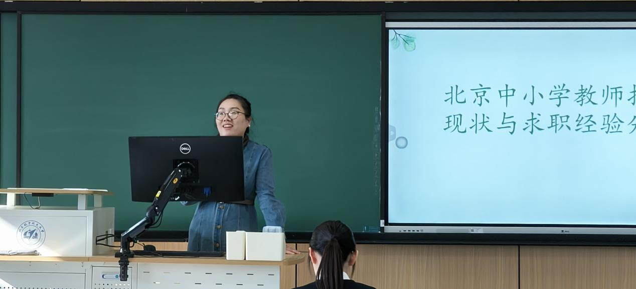 张妍老师则是从中小学教育行业就业现状出发,分享了中小学教师岗位的求职技巧,包括简历撰写技巧、实面能力细节等众多方面。她特别提醒到,应聘教师岗位需把专业技能训练练在平时,充分利用丰富的实习经历锻炼代课本领,以提高在求职过程中实战说课的教学能力。